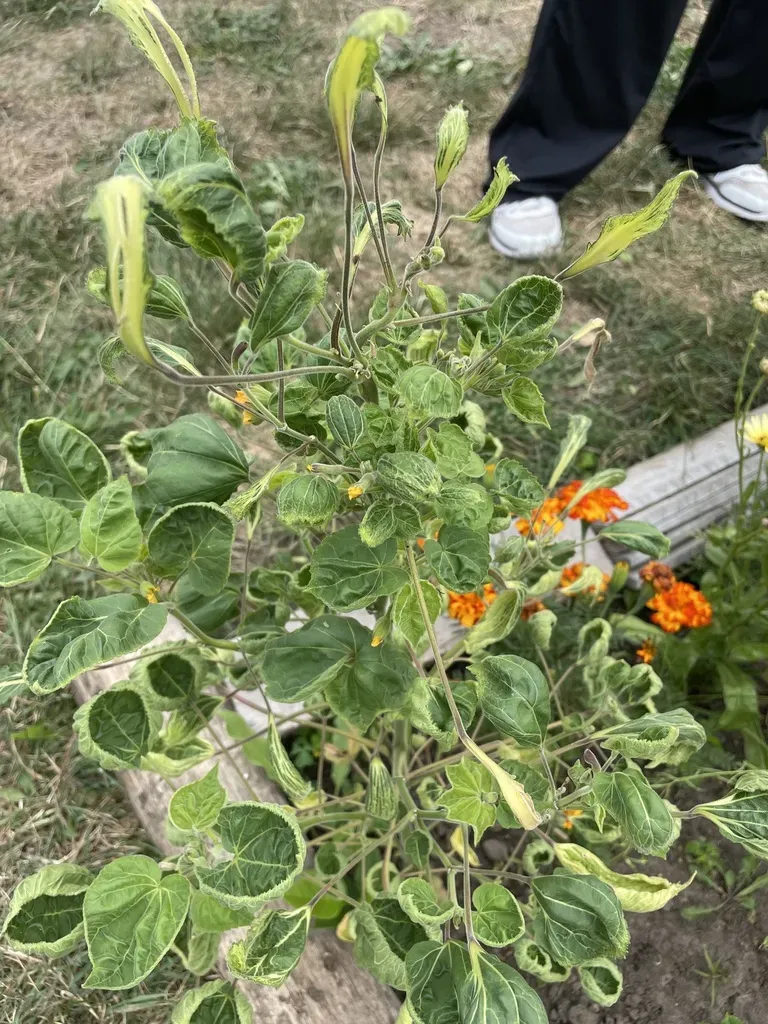 Abutilon theophrasti is an annual herbaceous plant in the mallow family, known for its large, heart-shaped, velvety leaves and tall, lanky growth habit.