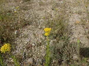 Achillea ageratum is a perennial herbaceous plant known for its narrow serrated leaves and clusters of small cream-colored flowers.