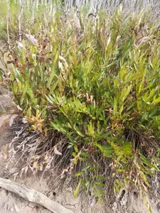 A clumping fern growing up to 1.5 meters tall with reddish-brown fertile fronds and pointed leaf tips, commonly found in mangrove and saline wetland environments.