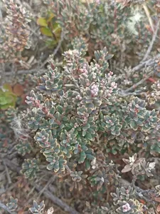 A low-growing, sprawling, evergreen shrub native to New Zealand, notable for its blue-green foliage and white to pink or red berries.