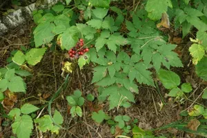 Actaea erythrocarpa, commonly known as Red Baneberry, is a herbaceous perennial plant native to Eastern North America, notable for its bright red berries and finely divided green foliage.