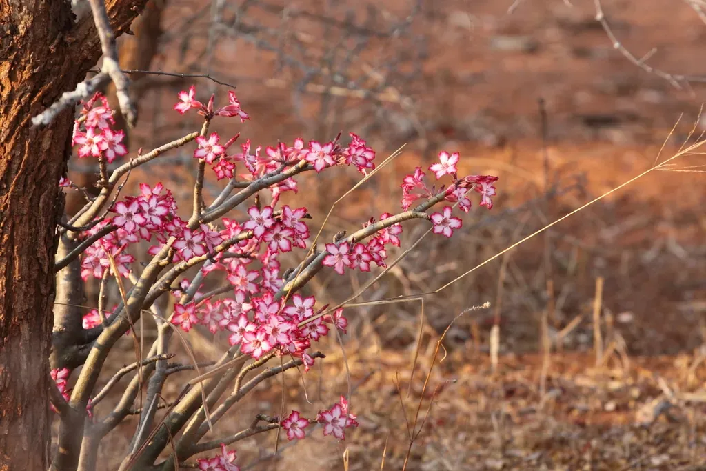 Adenium multiflorum is a small succulent tree native to central and eastern Southern Africa, known for its swollen silvery-grey stems and star-shaped flowers.
