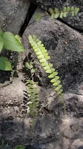 Adiantum malesianum is a delicate fern known for its fine-textured, bright green, fan-shaped fronds and black stems. It thrives in humid, shaded environments.