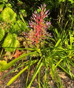 Aechmea bracteata is a bromeliad species native to Central America, known for its urn-shaped rosette of spiny leaves and colorful bracts.