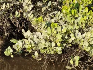 Aegiceras corniculatum is an evergreen shrub or small tree mangrove species growing up to about 6 meters tall, commonly found in mangrove ecosystems.