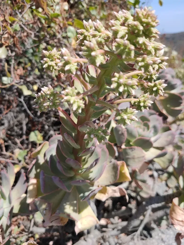 Aeonium percarneum is a succulent shrub forming rosettes of dark green leaves, growing up to 1 meter tall.