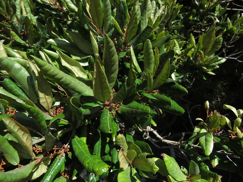 Aextoxicon punctatum is a dioecious evergreen tree native to southern Chile and Argentina, known for its leathery leaves and dense foliage.