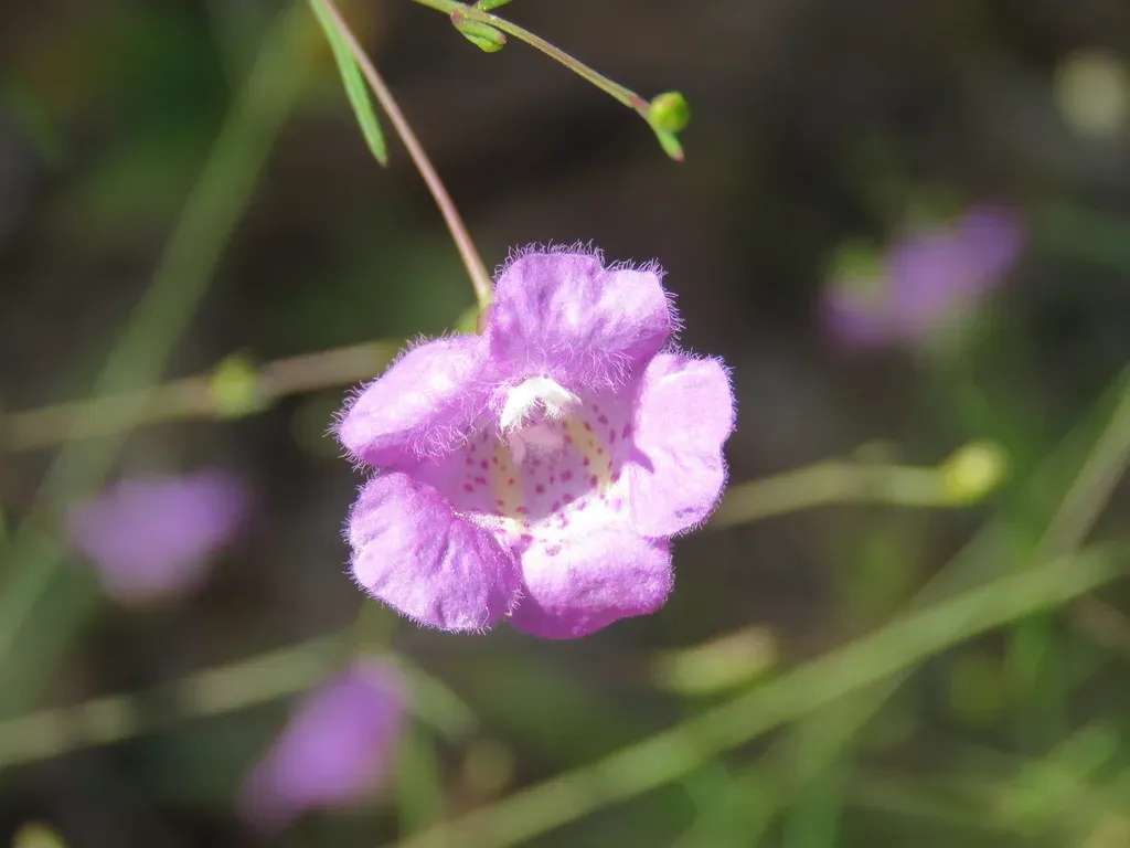 Round-stemmed False Foxglove (Agalinis Gattingeri) is a annual herb in the Orobanchaceae family with moderate care difficulty. It requires low watering and full sun or partial shade light in USDA hardiness zones 4-7. This plant is safe for cats and dogs.
