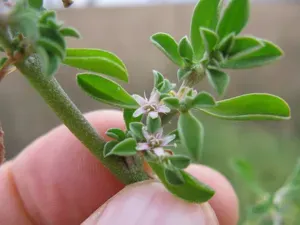 Coastal Galenia (Aizoon Pubescens) is a perennial herb in the Aizoaceae family with easy care difficulty. It requires drought-tolerant watering and full sun or partial shade light in USDA hardiness zones 9-11. This plant is safe for cats and dogs.