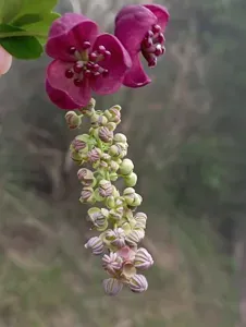 Akebia longeracemosa is a vigorous, semi-evergreen to deciduous climbing vine known for its ornamental foliage and unique, fragrant flowers.