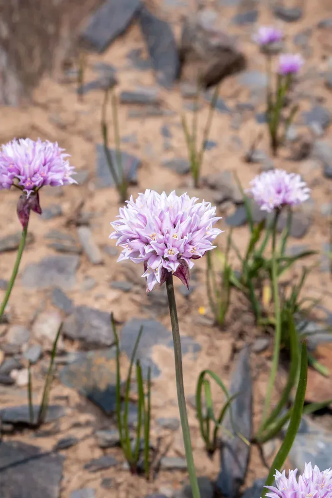 Allium geyeri is a perennial bulbous plant native to western North America, known for its narrow bulbs and pink bell-shaped flowers.