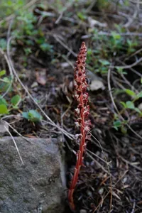 Allotropa virgata is a perennial, non-photosynthetic plant known for its distinctive white and red or maroon striped flower stalk, commonly called Sugarstick.