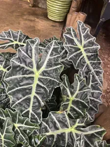 Alocasia micholitziana is an evergreen tropical plant known for its velvety dark green leaves with prominent white or light green veins.
