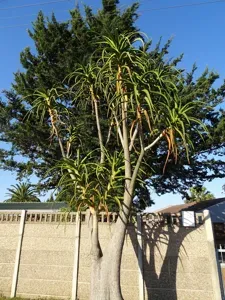 Aloidendron barberae is Africa's largest aloe-like plant, a fast-growing evergreen tree aloe with a smooth gray trunk and a rounded crown of fleshy, deep green, recurved leaves.