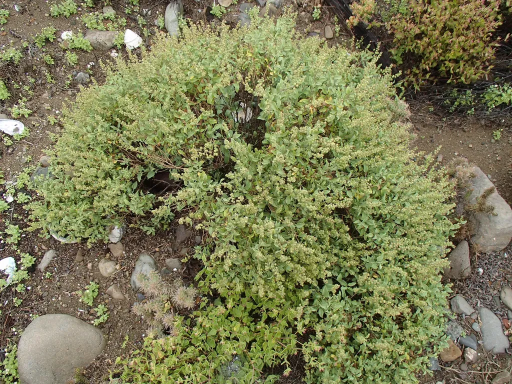 Ambrosia chenopodiifolia is a dense, perennial shrub native to southern California and Baja California, characterized by slender, tough branches with hooked spines and small oval leaves.