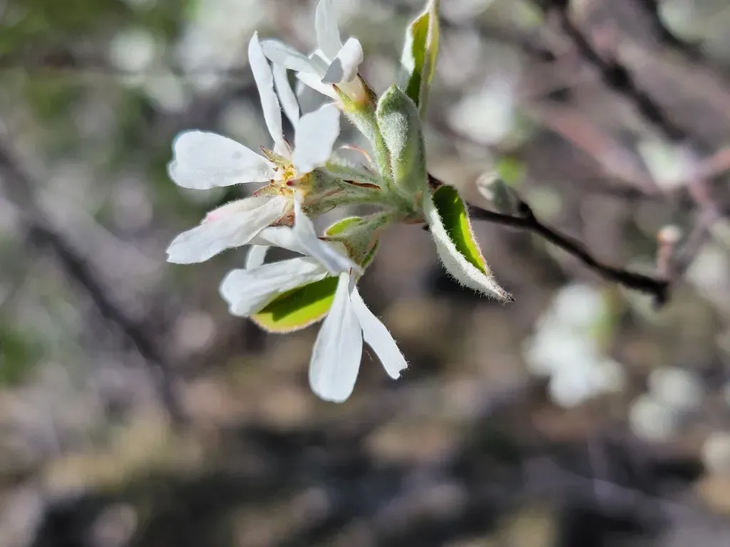Amelanchier ovalis is a deciduous shrub or small tree known for its large white flowers and edible pome fruits.