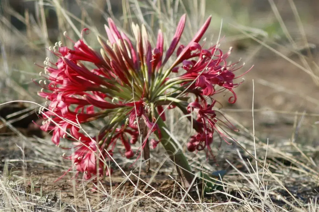 Ammocharis coranica is a perennial bulbous plant native to southern Africa, known for its striking summer-blooming flowers and rosette of sword-shaped leaves.