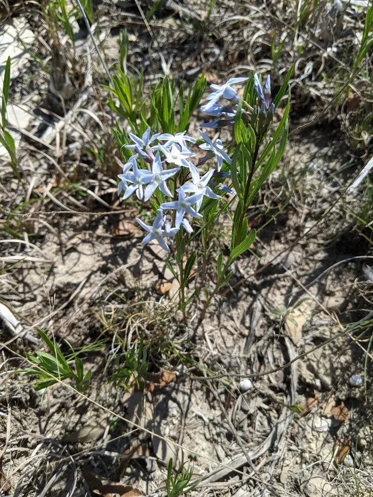 Amsonia ciliata is a clump-forming perennial known for its fine-textured, blue star-shaped flowers and narrow seed pods, native to the southeastern and south-central United States.