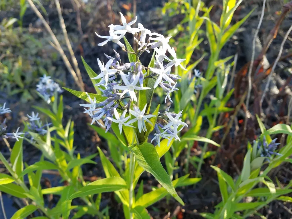 Amsonia tabernaemontana is a perennial herbaceous plant known for its star-shaped blue flowers and narrow leaves, native to the eastern United States.