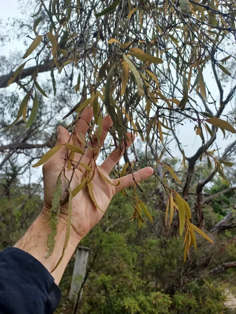 Amyema pendula is an evergreen, epiphytic, semi-parasitic shrub with pendulous stems, mainly found on Eucalyptus and occasionally on Acacia species.