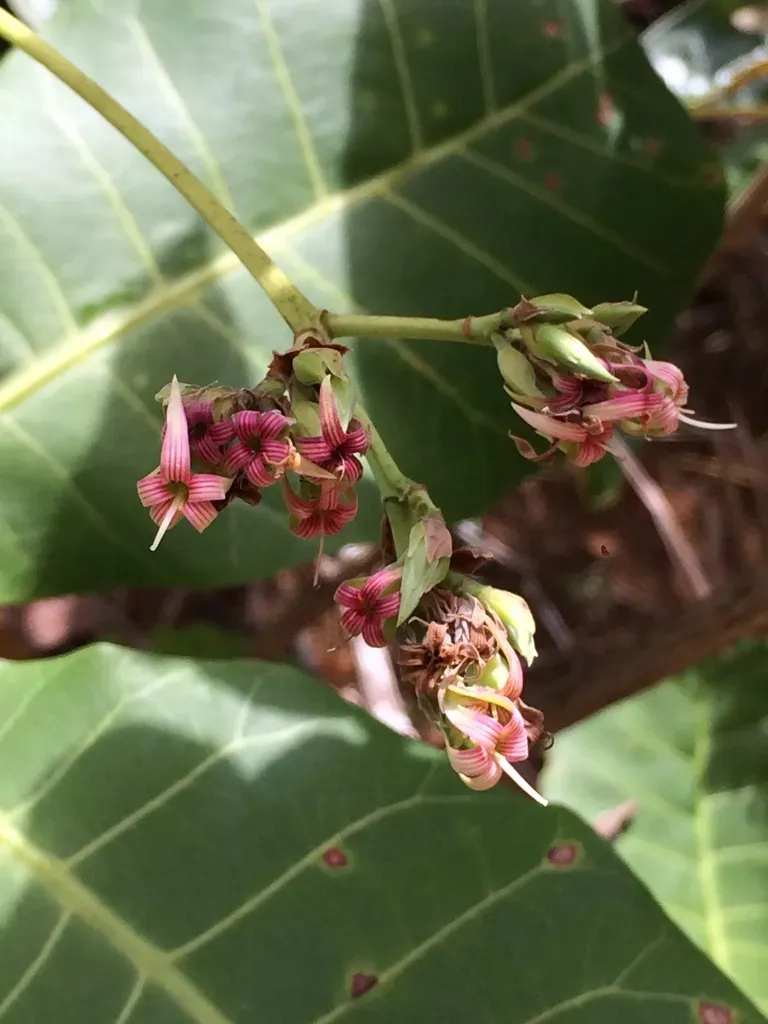 Anacardium occidentale, commonly known as cashew, is a tropical evergreen tree native to South America, widely cultivated for its edible nuts and fruit.