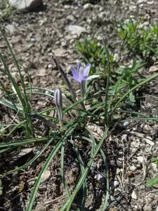 Androstephium coeruleum is a small perennial bulbous plant known for its attractive light blue to violet purple flowers and long, narrow leaves.