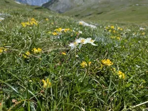 Anemonastrum narcissiflorum is a perennial herbaceous plant notable for its white, large flowers often tinged blue on the dorsal side and palmate, hairy leaves.
