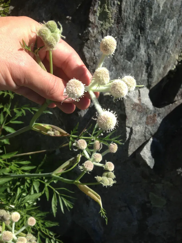 Angelica capitellata is a perennial herb known for its distinctive button-like white flowers that form umbels atop a stout, erect stem.