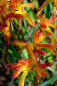 Anigozanthos humilis is a clump-forming evergreen perennial native to Southwest Australia, known for its strap-shaped leaves and tubular flowers in shades of green, yellow, orange, or red.