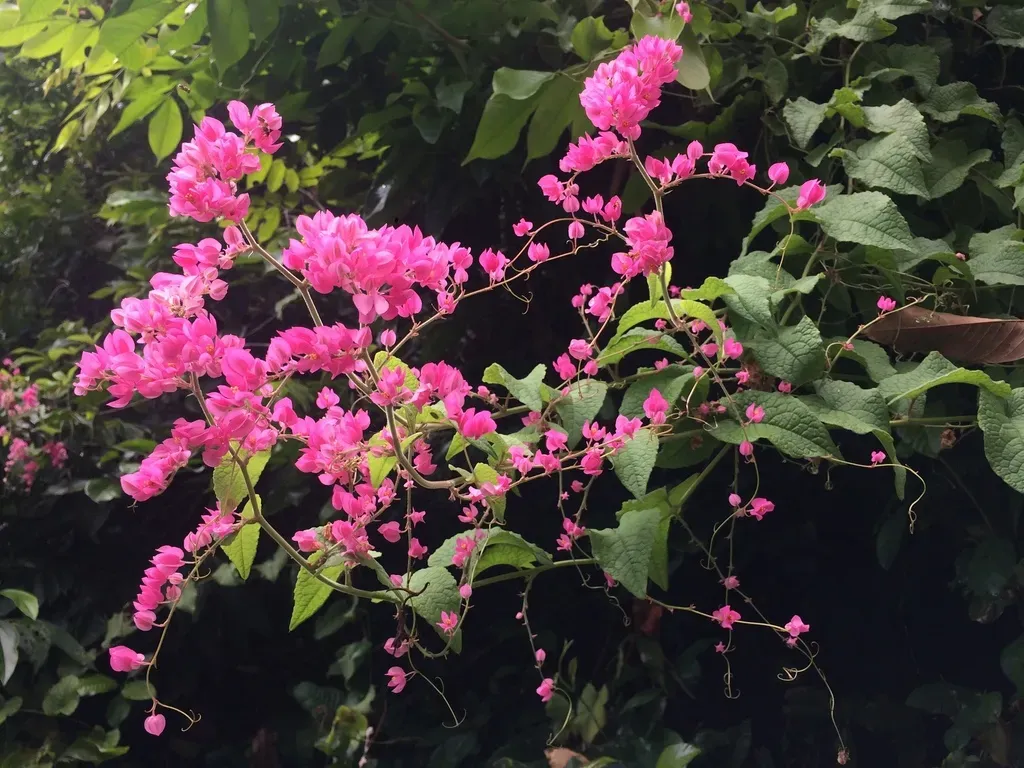 Antigonon leptopus is a fast-growing, tuberous-rooted tropical vine known for its dense clusters of bright coral-pink flowers.