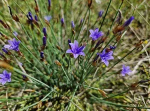 A tufted, hairless perennial with rush-like, tough, bluish-gray stems and delicate blue-violet flowers.