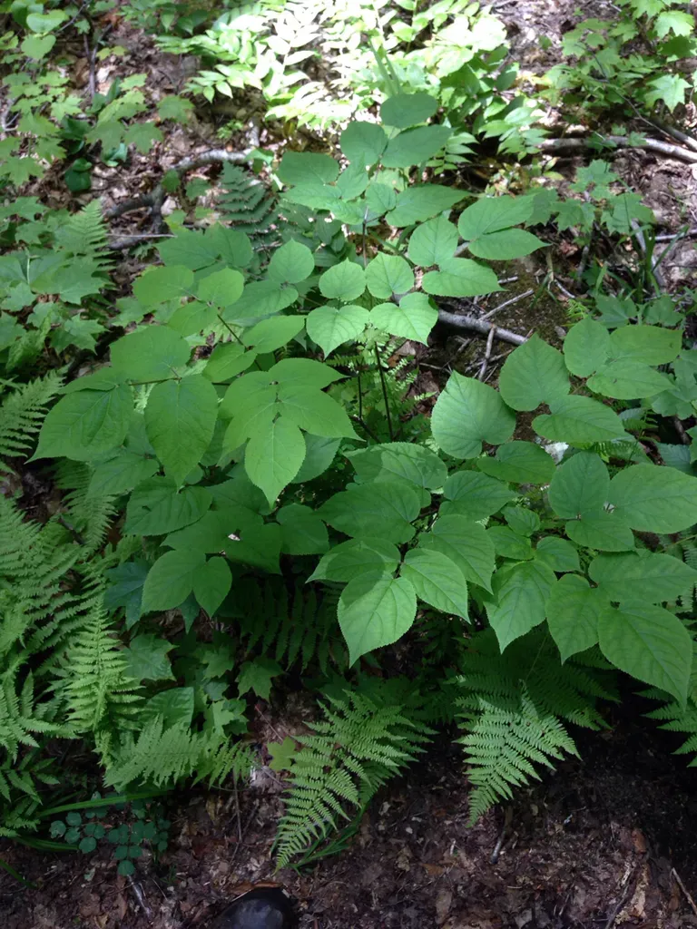 Aralia racemosa is a herbaceous perennial plant native to eastern North America, known for its large compound leaves and clusters of greenish-white flowers followed by reddish-purple berries.