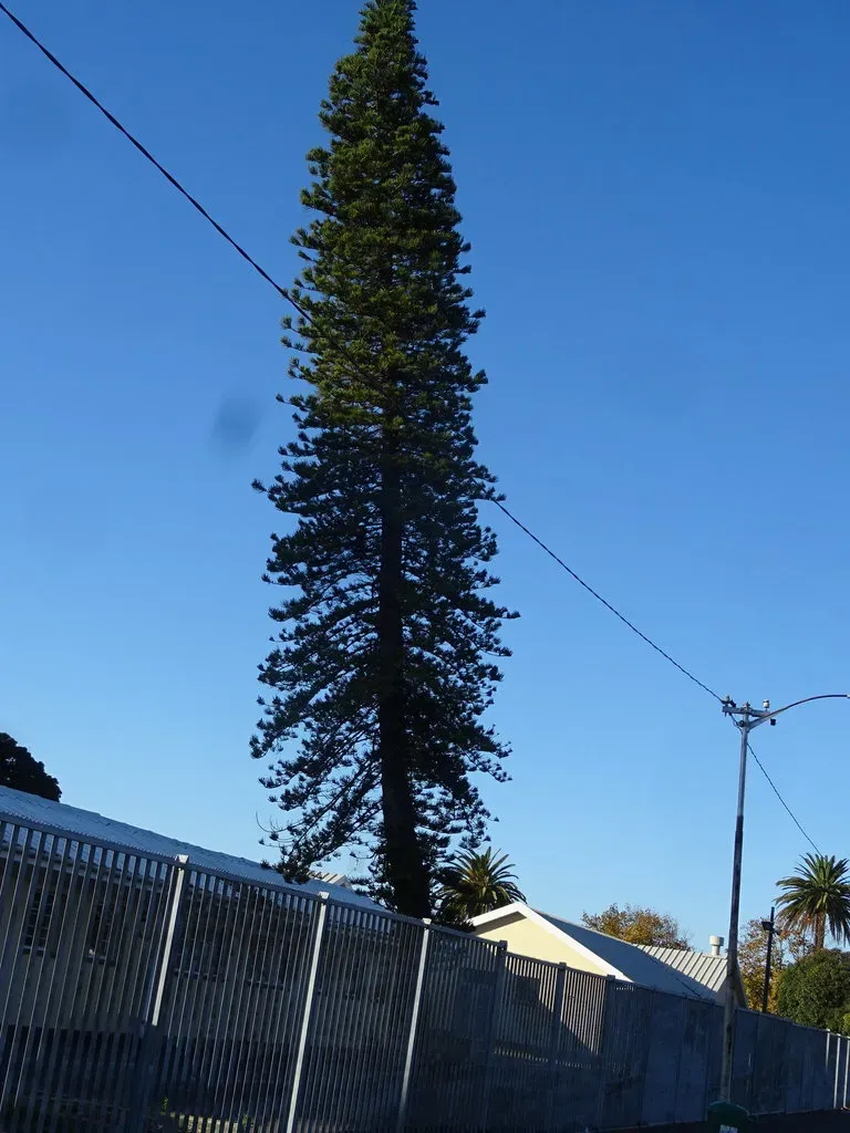 Araucaria columnaris is a tall, slender conifer native to New Caledonia, known for its distinctive narrow, columnar shape and spire-like crown.