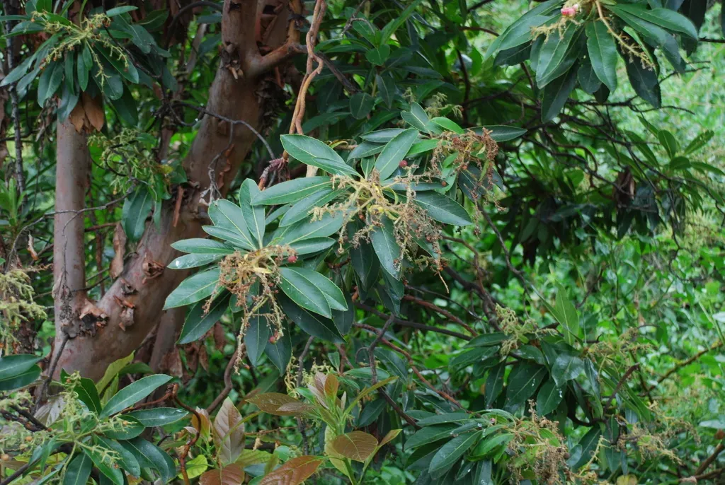 Arbutus canariensis is an evergreen shrub or small tree endemic to the Canary Islands, growing up to 10 meters tall with distinctive peeling bark and edible fruit.
