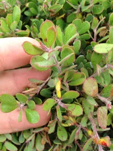 Arctostaphylos pumila is a petite, low-lying manzanita forming flat bushes and patchy, creeping mats in sandy soil.