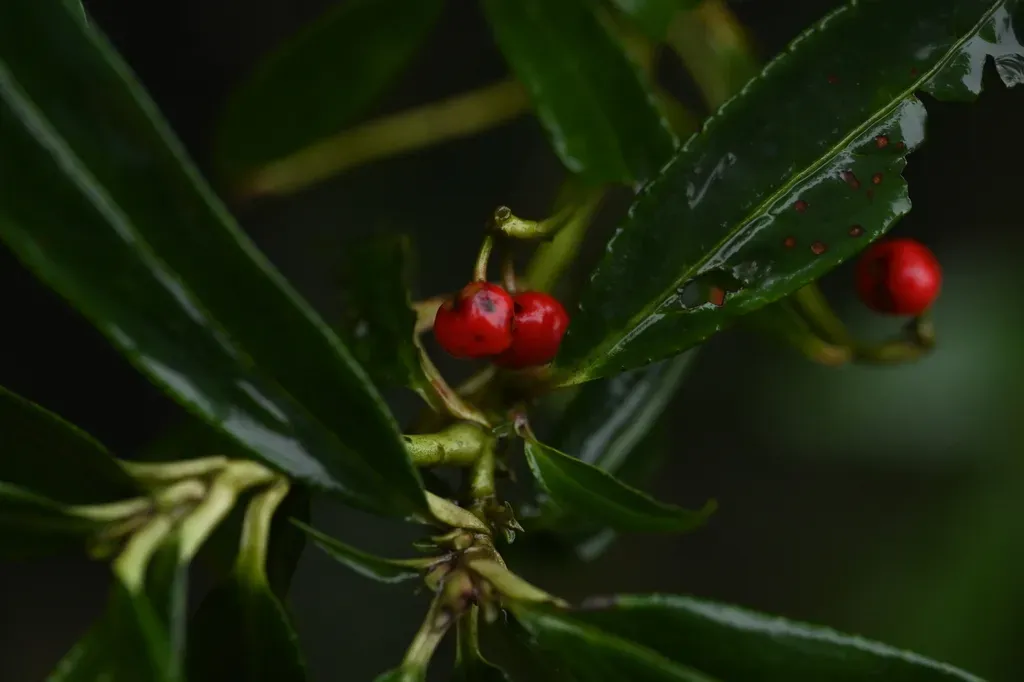 An evergreen perennial shrub with dark green leaves and long-lasting red berries, often grown as an ornamental.