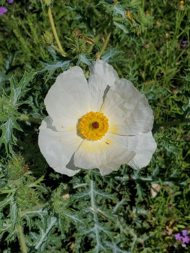 White Prickly Poppy (Argemone Albiflora) is a annual herb in the Papaveraceae family with easy care difficulty. It requires low watering and full sun light in USDA hardiness zones 7-10. This plant is toxic to cats and dogs — keep it out of reach of pets.