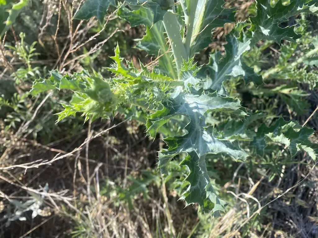 A branched, pale blue-green, leafy plant with large white flowers and yellow sap, covered in slender yellow prickles.