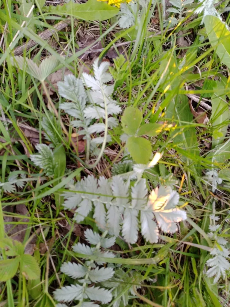 Argentina anserina, also known as silverweed, is a low-growing perennial herb in the rose family with distinctive silvery leaves and yellow flowers.