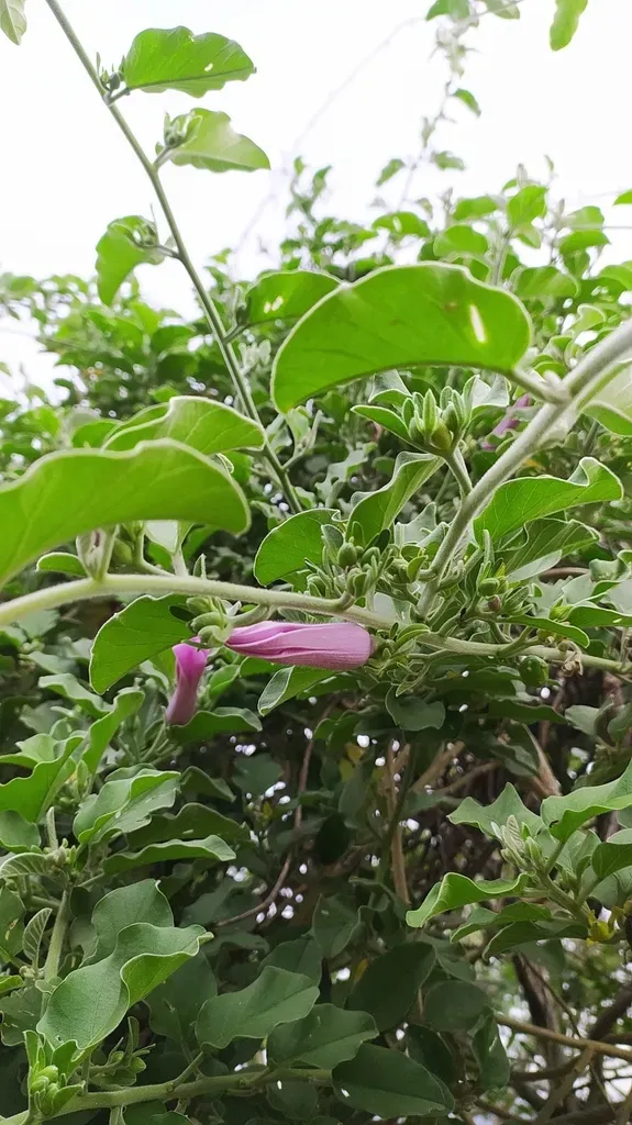 Argyreia nervosa is a perennial climbing vine known for its large heart-shaped leaves and showy lavender-pink trumpet-shaped flowers.
