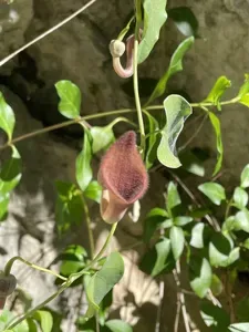 Aristolochia baetica is a climbing vine native to Portugal, Spain, and North Africa, known for its distinctive saxophone-shaped brown-purple to mahogany flowers and heart-shaped blue-green leaves.