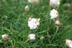 Armeria arenaria is a perennial flowering plant known for its compact tufts of grass-like leaves and globe-shaped clusters of pink or white flowers.