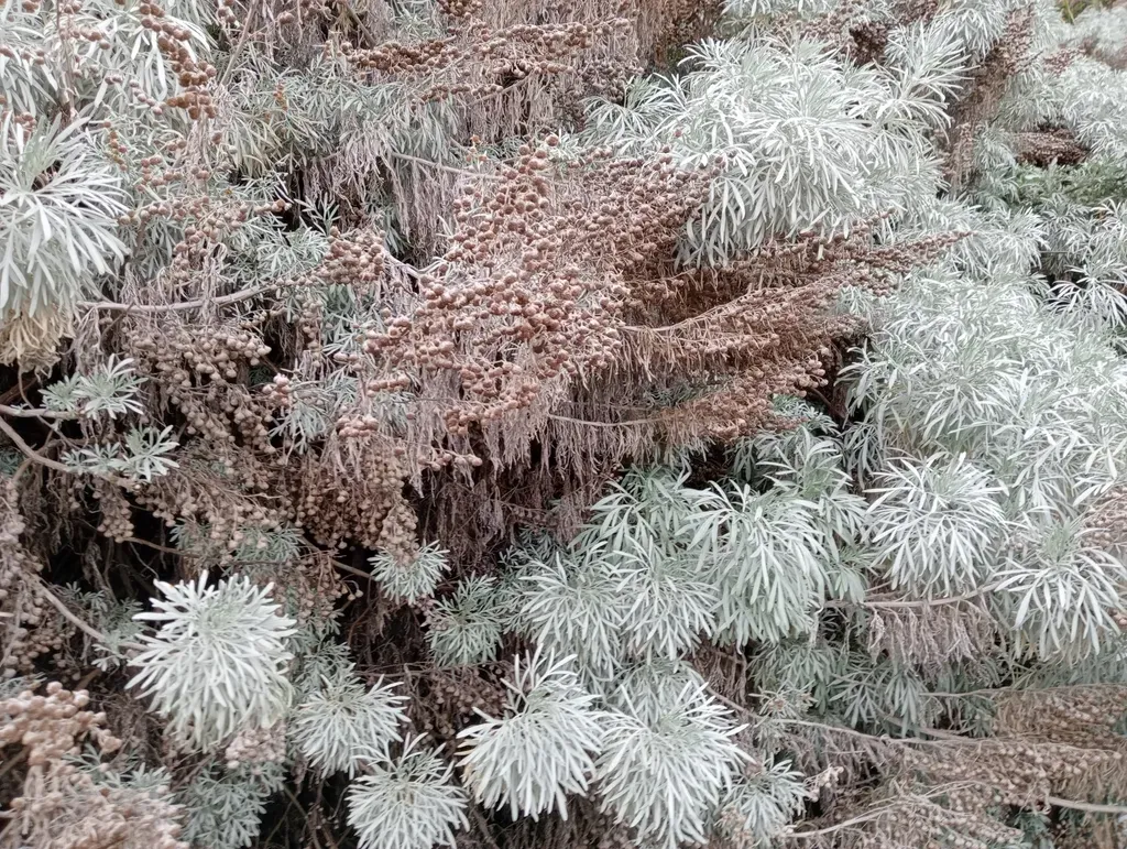 An evergreen, aromatic shrub with finely divided, silvery-white foliage and yellow daisy-like flowers, native to the Mediterranean region.
