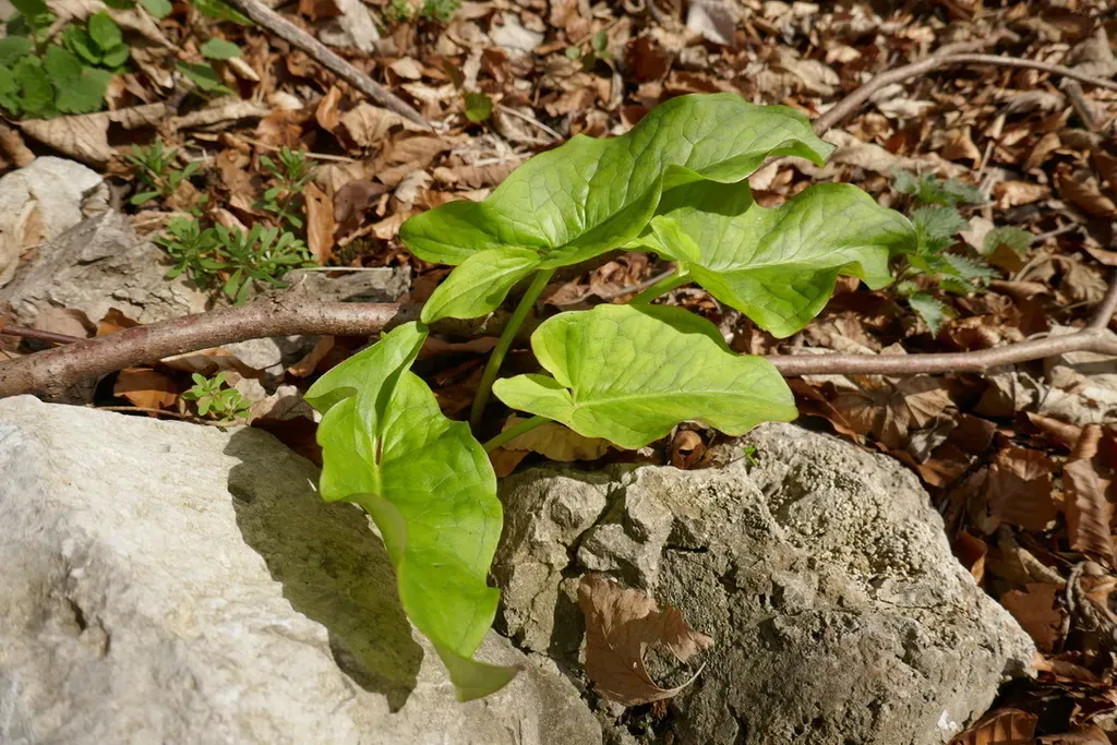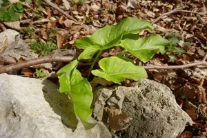 Arum cylindraceum is a woodland perennial plant species belonging to the family Araceae, known for its distinctive arrow-shaped leaves and club-shaped spadix enclosed in a hood-like spathe.