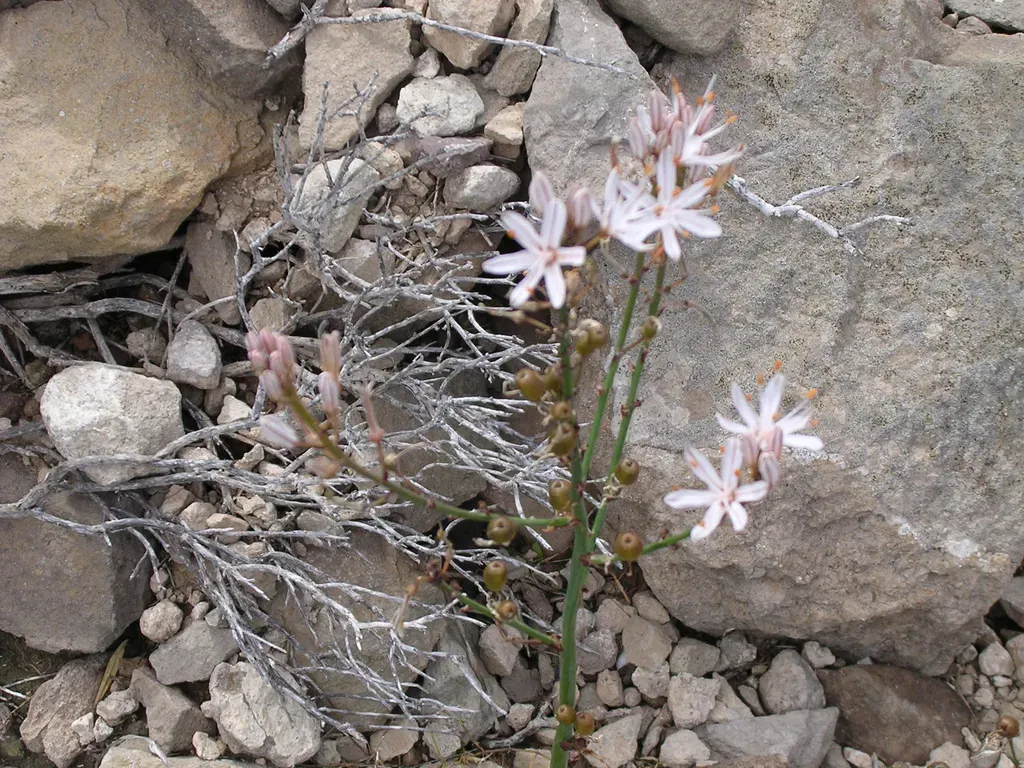 Asphodelus ramosus is a perennial herbaceous plant native to the Mediterranean region, known for its tall spikes of white star-shaped flowers with prominent stamens and pinkish midribs.