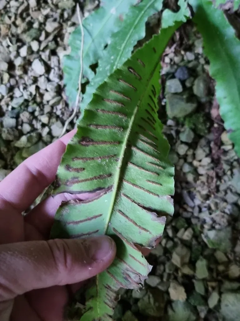 An evergreen fern with distinctive strap-shaped, undivided fronds resembling a hart's tongue.