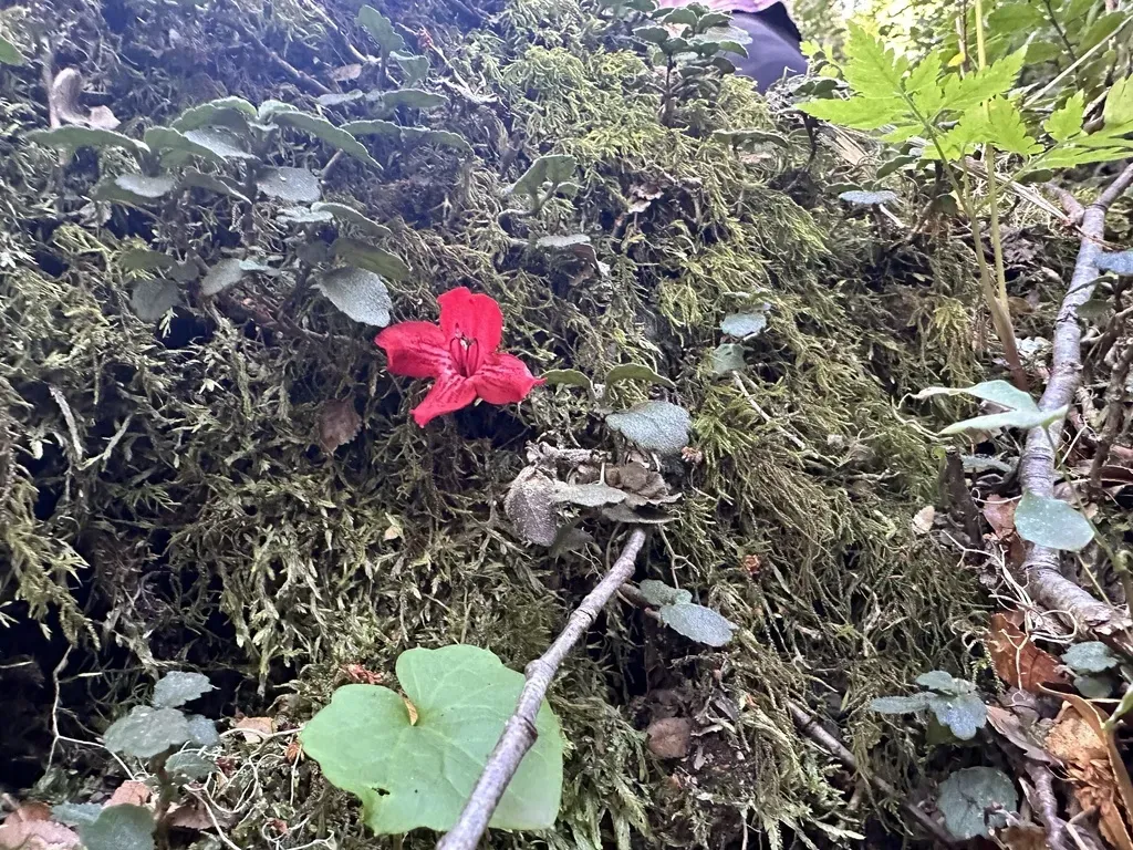 Asteranthera ovata is an evergreen, self-clinging climber with small, oval, opposite pairs of bristly leaves and bright red tubular flowers about 6 cm long.