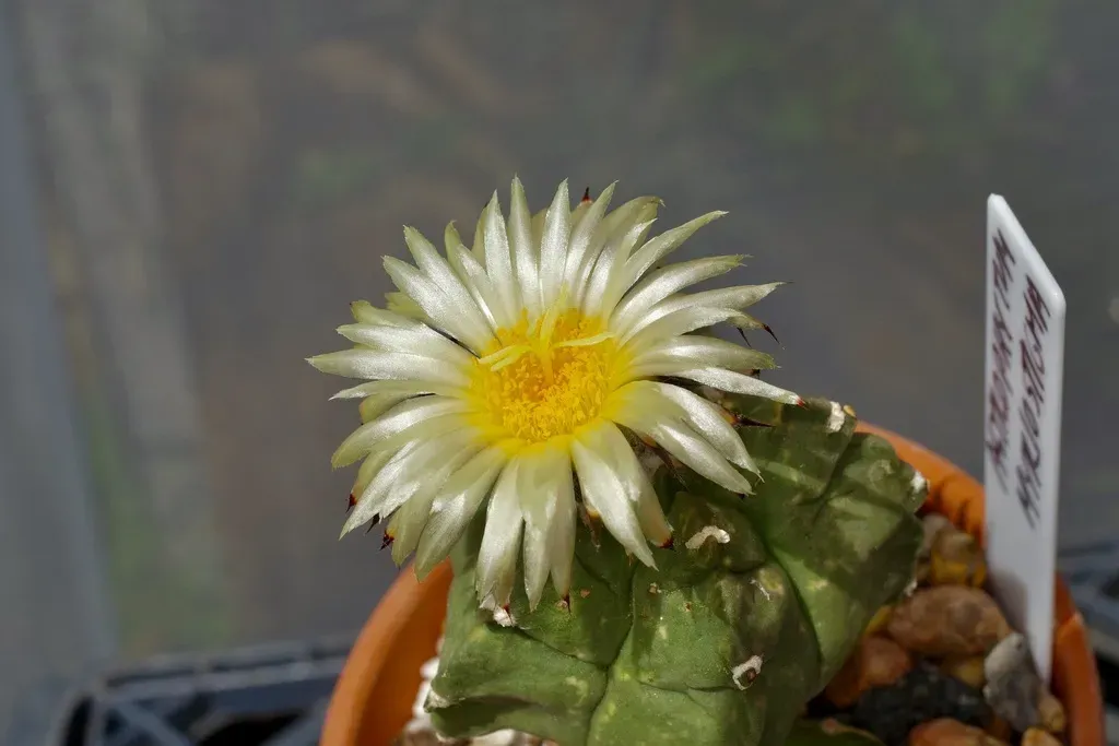 Astrophytum myriostigma is a spineless cactus native to Mexico, known for its star-shaped ribbed body and woolly areoles.