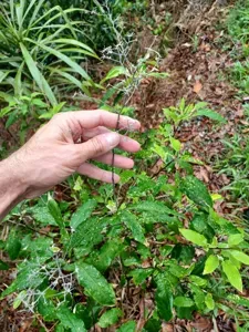 Broad-leaf Star Hair (Astrotricha Latifolia) is a perennial shrub in the Araliaceae family with easy care difficulty. It requires moderate watering and partial shade or dappled_shade light in USDA hardiness zones 9-11. This plant is safe for cats and dogs.