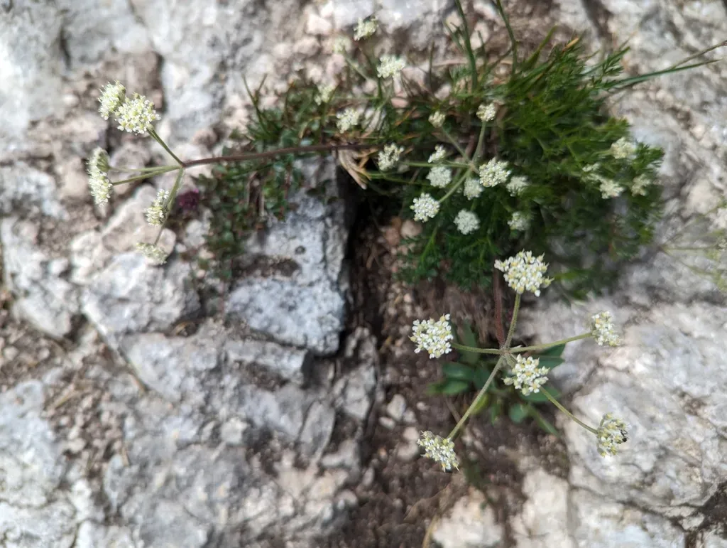 Athamanta cretensis is a perennial herbaceous plant from the Apiaceae family, native to parts of Europe, known for its white blossom panicles and insect-pollinated flowers.